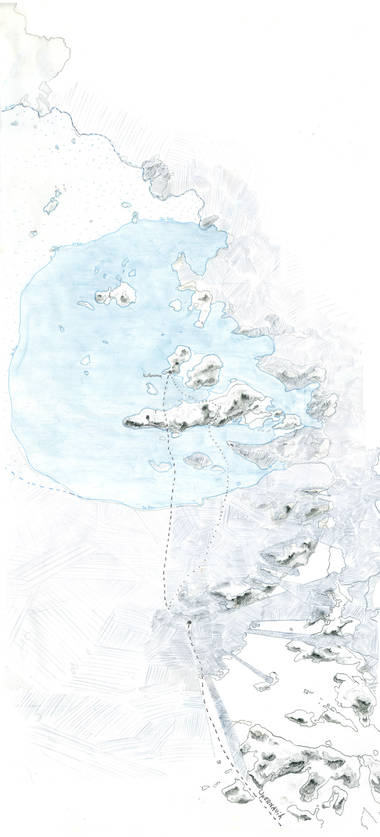 Quand nous parlons de Kullorsuaq, nous parlons du village, mais nous nommons en vérité l'île tout entière (Kullorsuaq = le grand pouce). Car le village n'est qu'un rassemblement d’individus à un moment donné, dans l'espace continu de la nature. En hiver, avec la banquise, l'île se fond dans le territoire pour ne faire qu'un avec lui, et l'espace visible et praticable s'étend loin sur la mer gelée. En été, une fois la banquise disparue, l'île retrouve ses contours, nous sommes de nouveau sur l'île de Kullorsuaq. Il n'existe pas de paysage fixe.