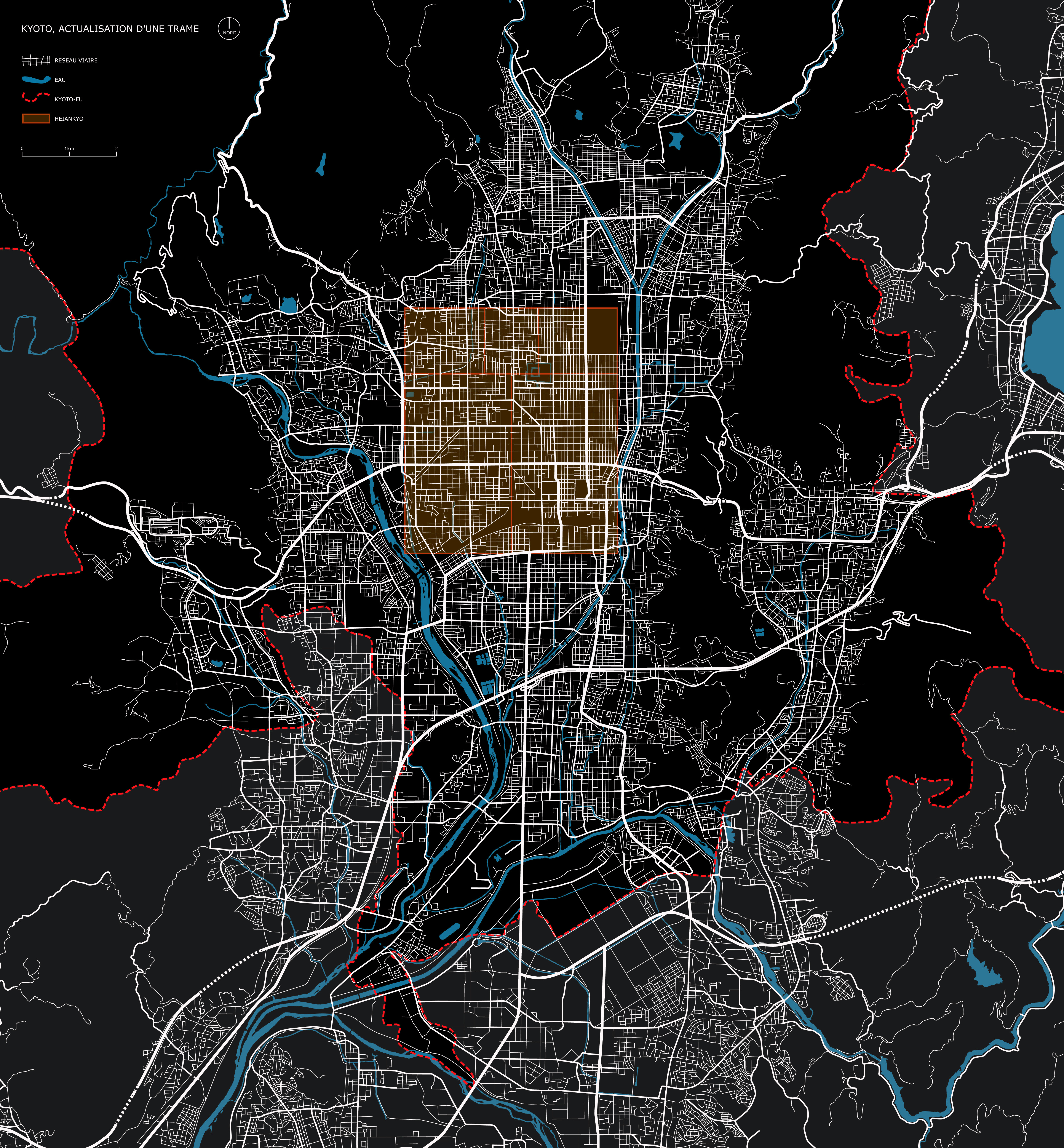 Les trames de Kyoto : une leçon fertile, à la fois sur la grille urbaine et sur la grille typographique. La variété est inscrite dans la géométrie, celle-ci n'étant répétitive qu'à première vue. La déclinaison des échelles permet de comprendre comment s'y déploie un principe de variation interne. La grille est parcourue par l'onde de la transformation urbaine : la succession des tracés viaires jusqu'à aujourd'hui, témoigne de la dynamique du plan de la ville, inscrite dans le temps historique. (Marion Rhein)
